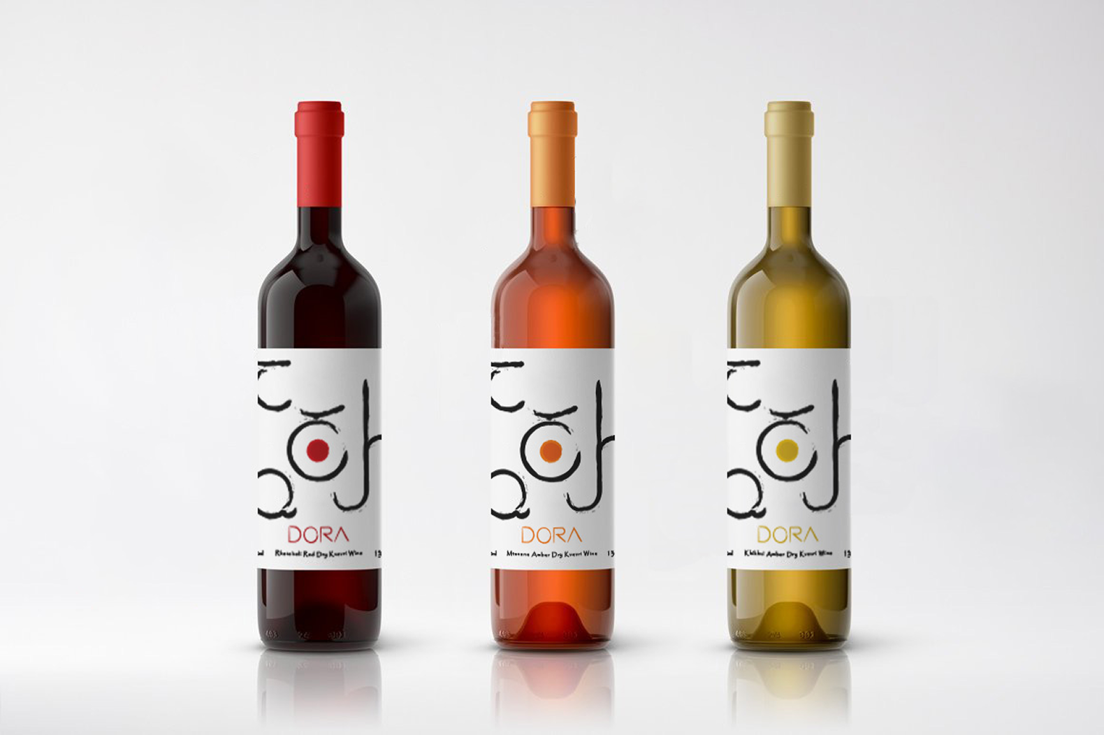 The label design draws from the ancient Georgian script Asomtavruli, using its distinct forms to spell out the name DORA. The letter D takes center stage, stylized to resemble a kvevri, the traditional clay vessel used for aging Georgian wine. This form is filled with the deep tone of the wine itself, connecting language, history, and material in a single symbol.